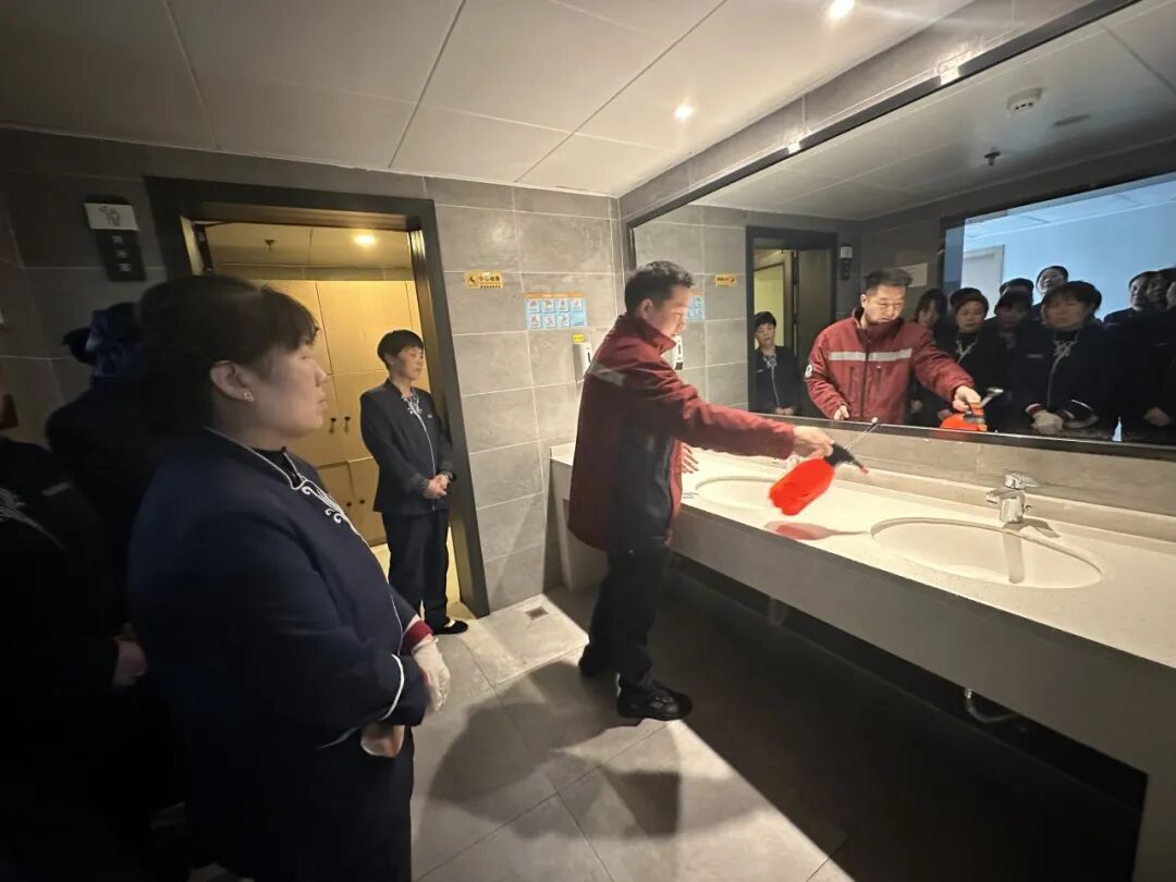 结合培训要求以及近期流感防控需求,项目部进一步优化日常消杀工作,升级消杀计划,增加重点强化区域。针对门把手、电梯按钮、楼梯扶手等高频接触部位,以及大厅、走廊等人员流动密集区域,实施强化消毒。通过“定时巡查+动态补位”机制,确保消杀工作全覆盖、无死角,切实保障环境安全。